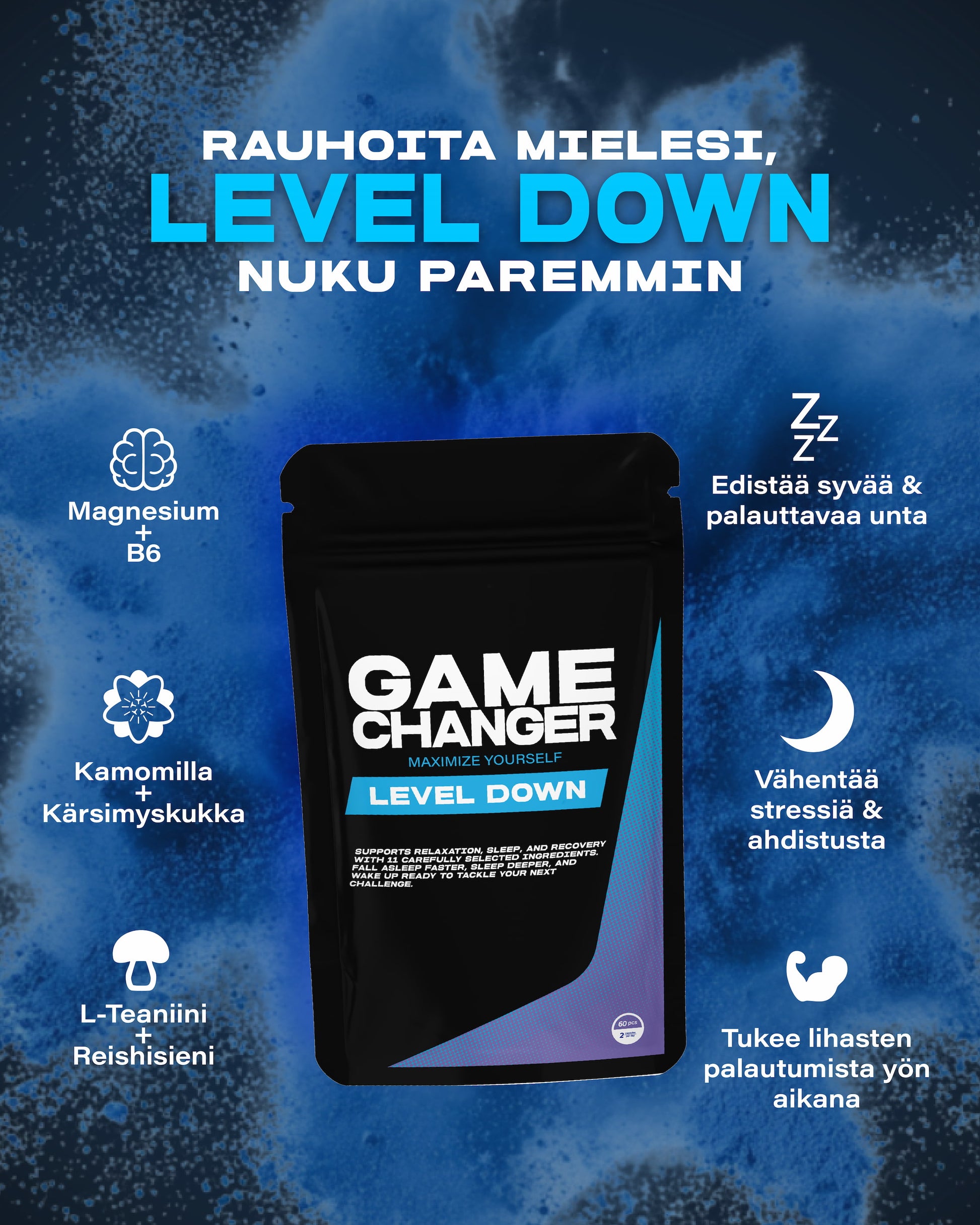 Hektisen arjen tai intensiivisen harjoittelun keskellä unta ei kannata unohtaa – laadukas yöuni on avain palautumiseen ja energiseen päivään. Level Down on täydellinen lisä iltarutiiniisi, kun haluat rauhoittaa mielesi ja auttaa kehoasi laskeutumaan lempeään, syvään uneen. Tuote on erityisesti suunniteltu sinulle, joka koet stressin aiheuttavan haasteita rauhoittumisessa, nukahtamisessa ja unen laadussa.