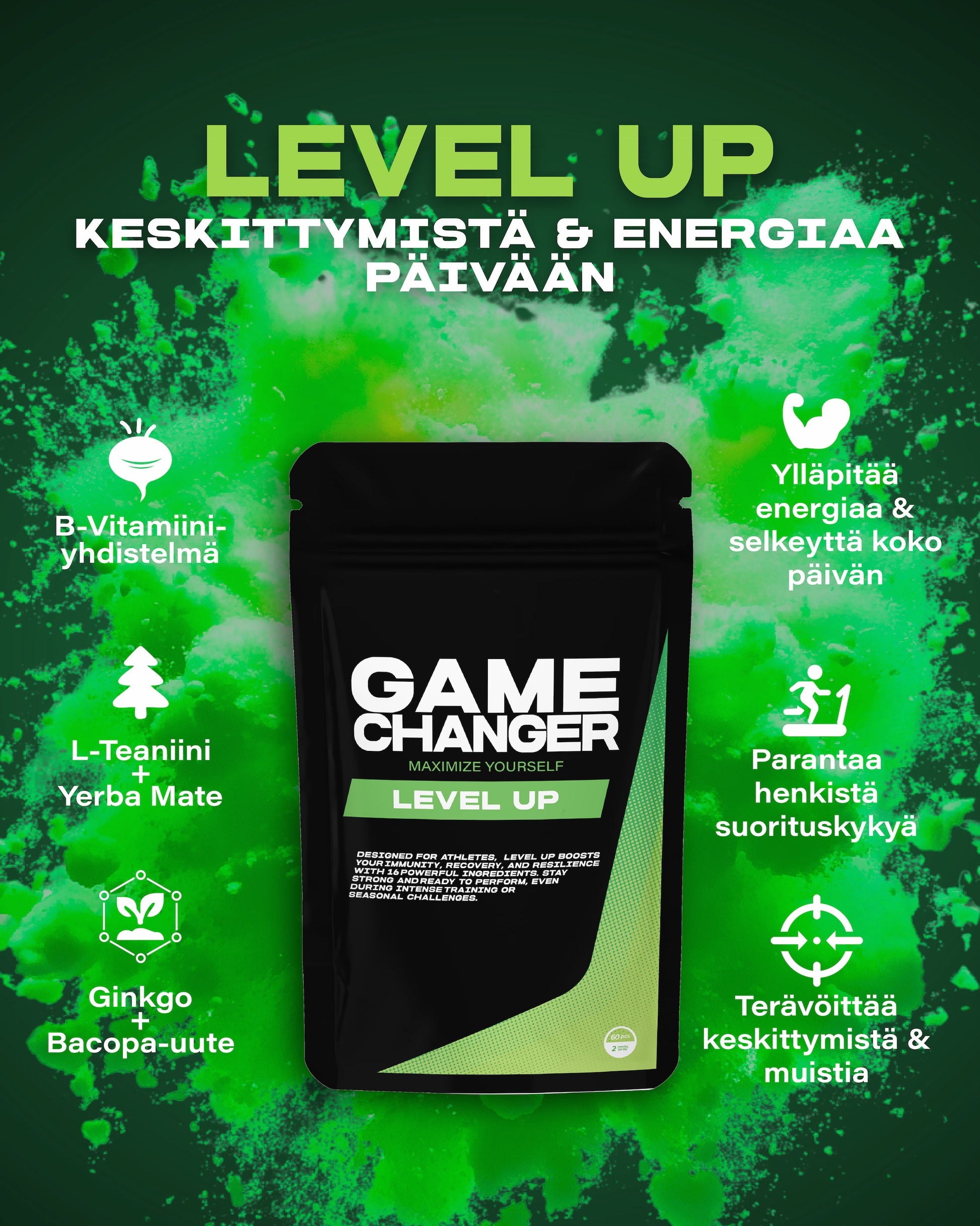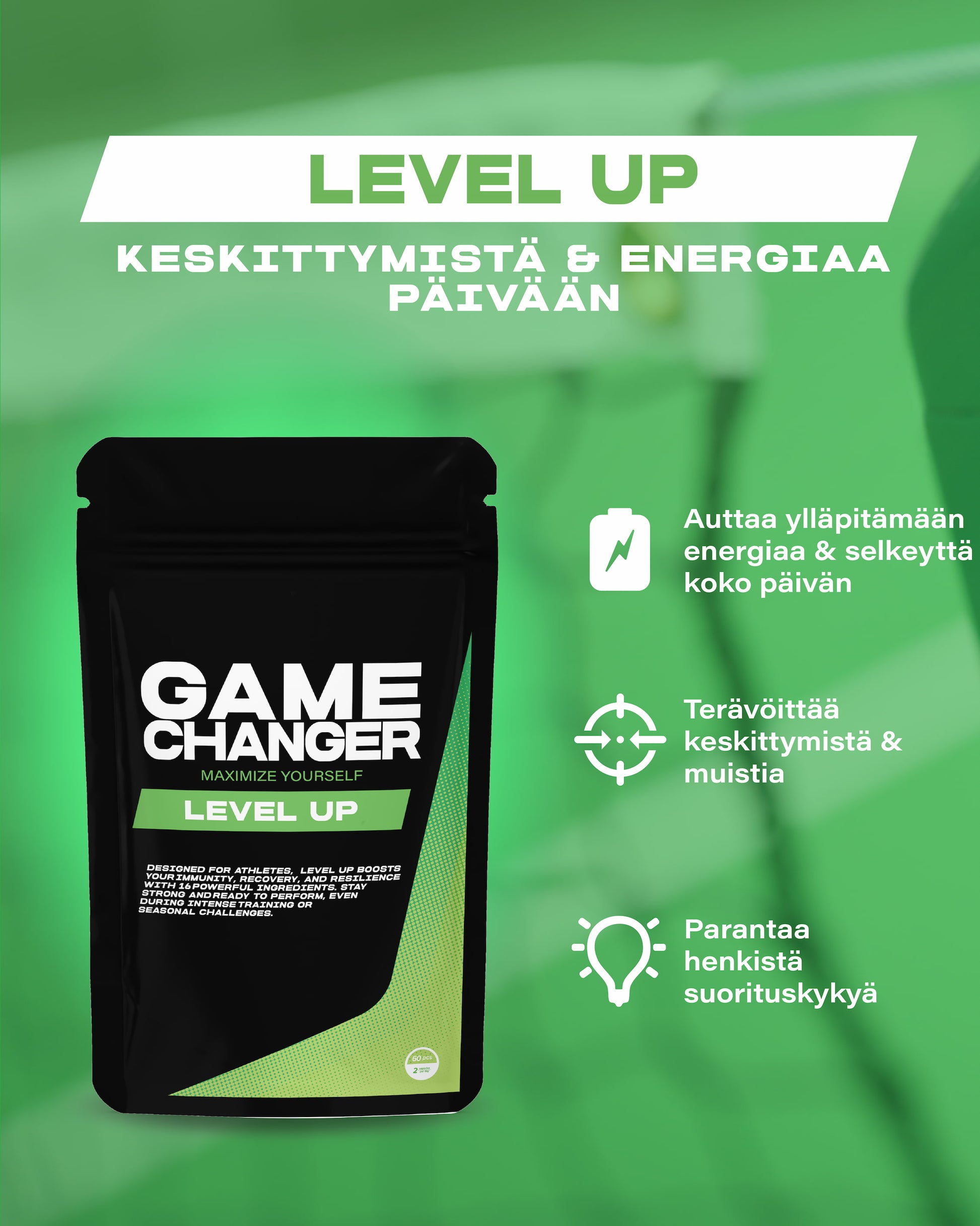 Level Up on kehitetty juuri näitä hetkiä varten, kun haluat nostaa suorituskykyäsi ja keskittymistäsi – olitpa sitten töissä, opiskelemassa, harjoittelemassa tai kehittämässä luovuuttasi. Se on 16:tta luonnollista ainesosaa sisältävä, kokonaisvaltainen ravintolisä, joka tukee mielen ja aivojen toimintaa. Se auttaa tehostamaan keskittymiskykyä ja muistia heti, ja pitkäaikaisessa käytössä se edistää aivojen terveyttä luonnollisesti.